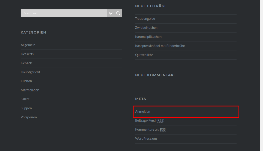 Um ein Rezept schreiben zu dürfen, muss man angemeldet sein. Den Link zur Anmeldung findet man ganz unten auf der Hauptseite: