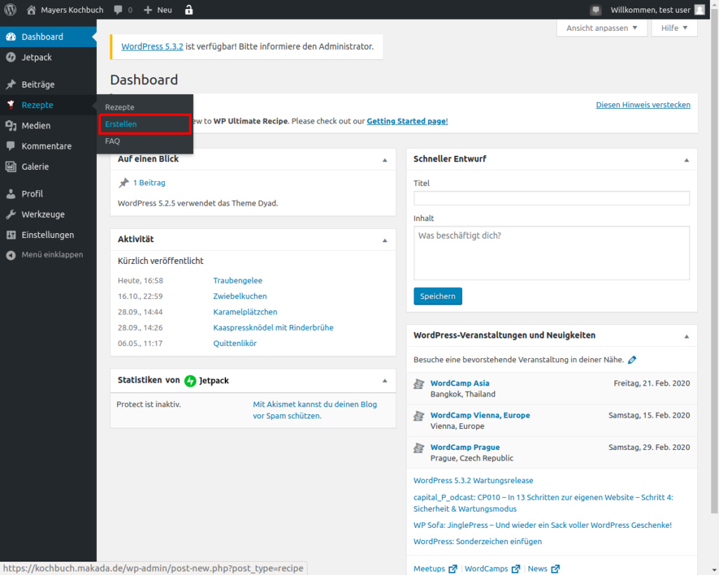 … und landet im Dashboard, das eine Übersicht über den internen Bereich anzeigt. Im Untermenü Rezepte befinden sich alle relevanten Funktionen zur Verwaltung der Rezeptsammlung. Zum Erstellen eines neuen Rezeptes klickt man auf Erstellen.