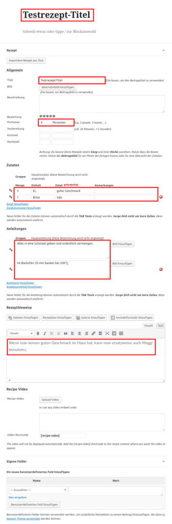 Die wichtigsten Einträge um ein Rezept zu erstellen sind in diesem Beispiel rot hervorgehoben. Sowohl die Zutatenliste als auch die Anleitung kann zusätzlich in Gruppen unterteilt werden. So kann man beispielsweise die Zutaten und die notwendigen Arbeitsschritte für den Teig und die Creme bei einer Torte trennen.