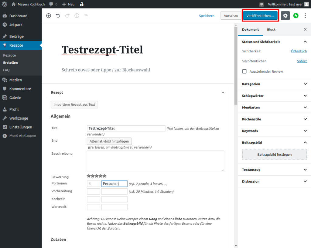 Ist alles fertig, kann man das Rezept mit einem Klick auf Veröffentlichen online stellen. Alternativ kann man mit Speichern einen Entwurf speichern. Man kann ein Beitragsbild und ein Alternativbild hochladen, damit das Rezept auch optisch gut wirkt.