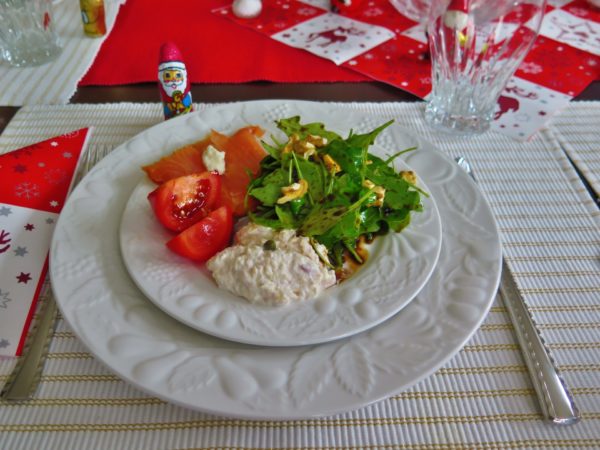 - Forellenfilets/Lachs in kleine Stücke zerdrücken und Zwiebel klein schneiden.