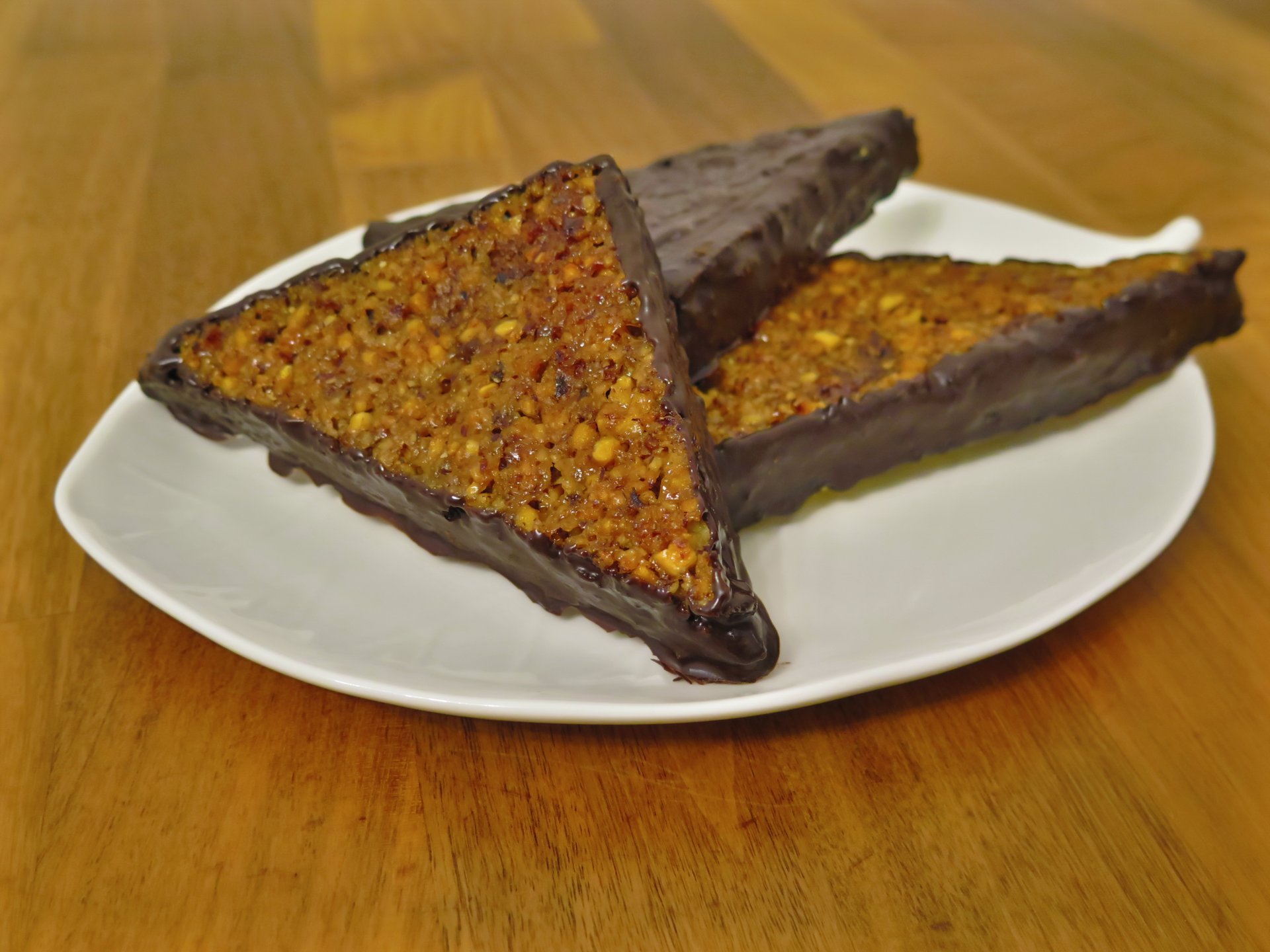 - Das abgekühlte Gebäck in Vierecke und dann diagonal in Dreiecke schneiden und die Kanten oder Ecken mit Schokolade bestreichen.