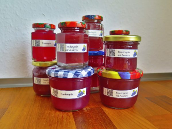 Wer etwas besonders möchte, nimmt statt 750 ml Traubensaft nur 650 ml und gibt noch 100 ml Amaretto oder Portwein dazu. Alles zusammen mit dem Gelierzucker laut Rezept kochen.