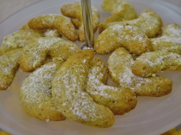 - Puderzucker und Vanillezucker mischen, die noch heißen Kipferl aus dem Backofen holen und dies in der Mischung wälzen.